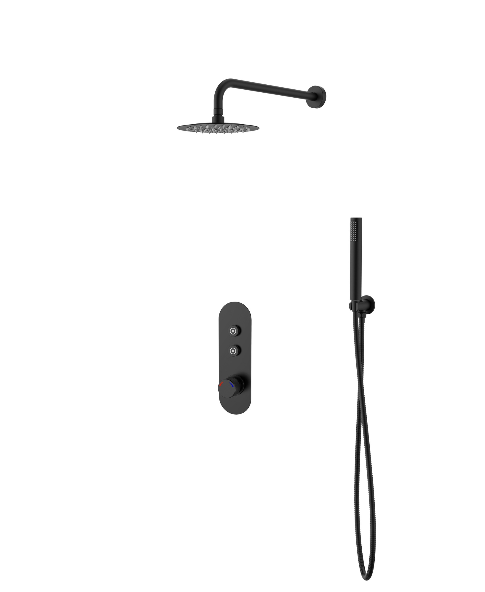 Главная Продукция ДУШЕВАЯ ПРОГРАММА Душевой комплект скрытого монтажа с термостатом, чёрный матовый, верхний душ размер 250мм