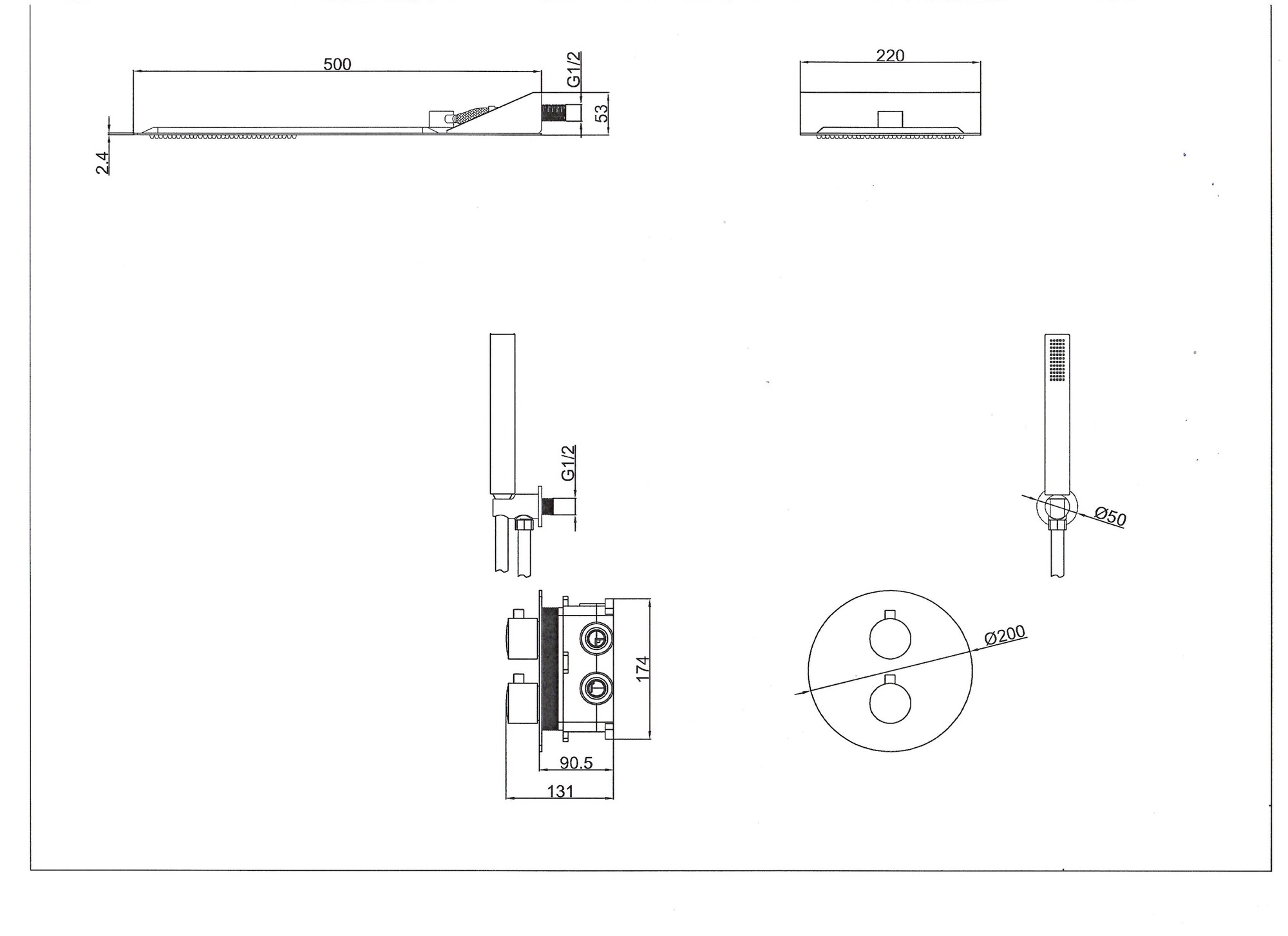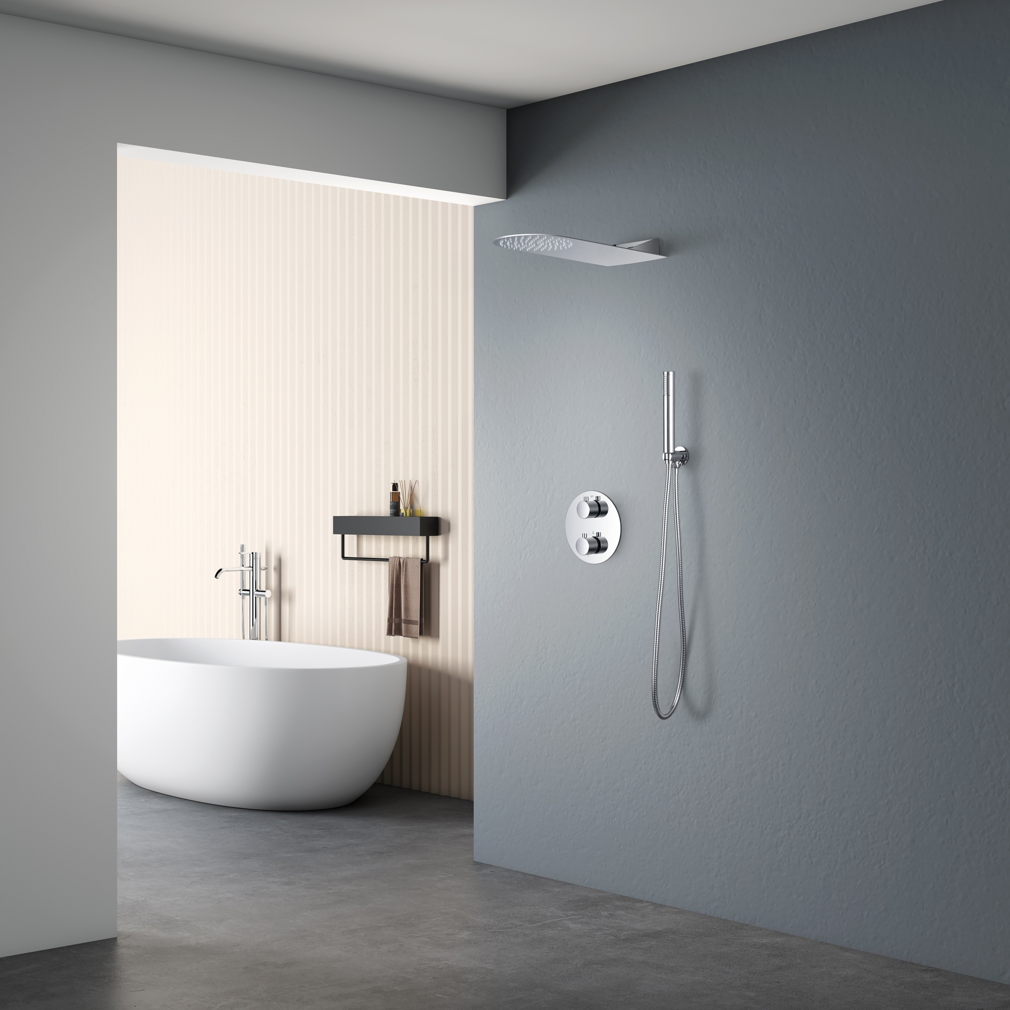Главная Продукция ДУШЕВАЯ ПРОГРАММА Душевой комплект скрытого монтажа с термостатом, хромированный, верхний душ размер 500 х 220 мм