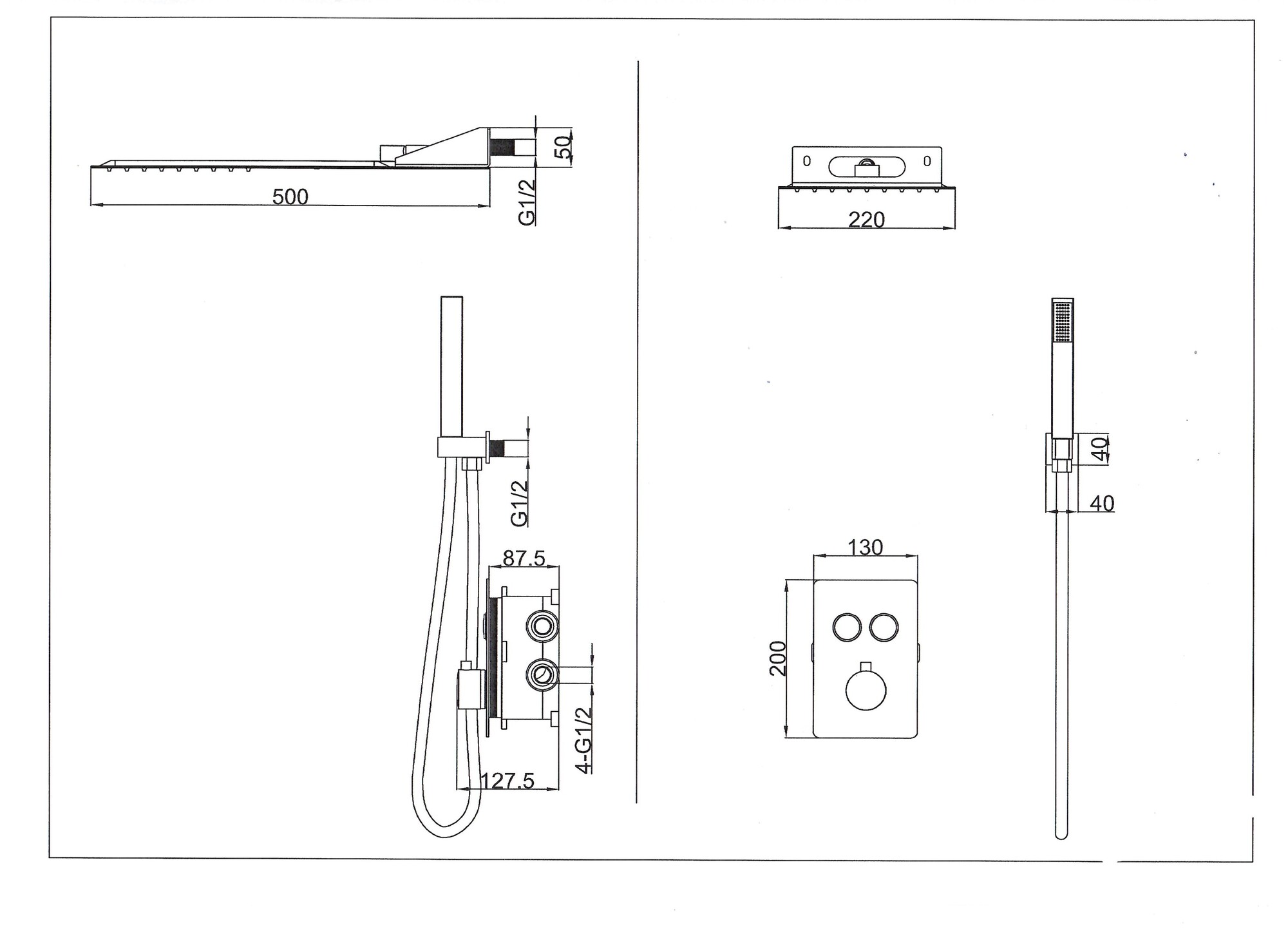 Душевой комплект скрытого монтажа с термостатом, хромированный, верхний душ размер 500 х 220 мм