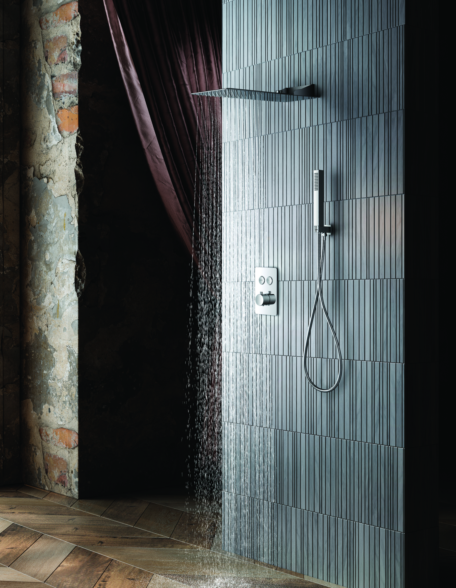 Главная Продукция ДУШЕВАЯ ПРОГРАММА Душевой комплект скрытого монтажа с термостатом, хромированный, верхний душ размер 500 х 220 мм