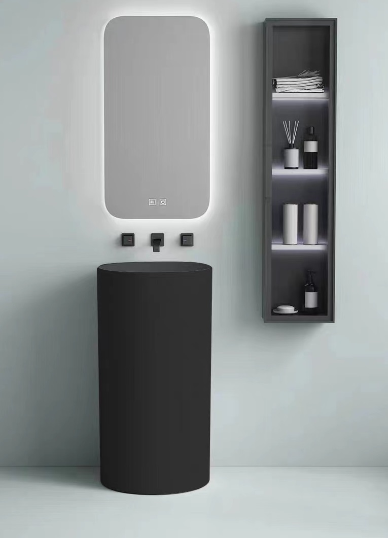 Главная Продукция РАКОВИНЫ Раковины напольные Раковина керамическая напольная (моноблок) чёрная матовая без отверстия под смеситель.