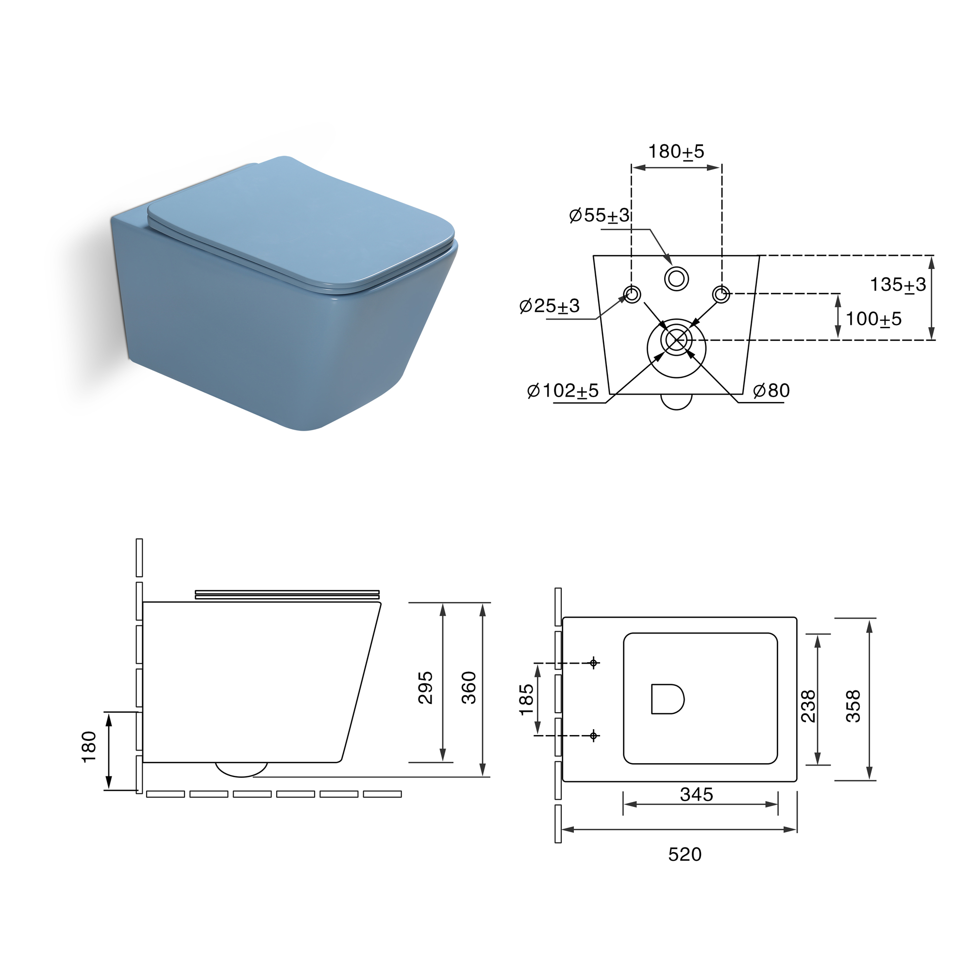 Главная Продукция УНИТАЗЫ Унитазы цветные Унитаз подвесной, безободковый,система смыва Tornado (голубой матовый)