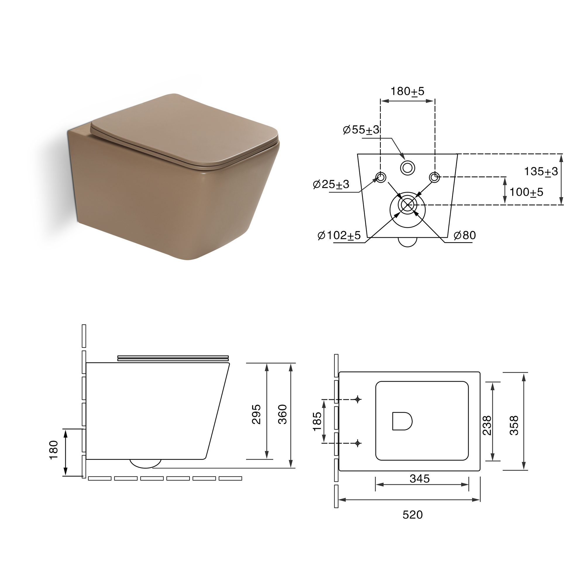 Главная Продукция УНИТАЗЫ Унитазы цветные Унитаз подвесной, безободковый, система смыва Tornado (светло-коричневый матовый)