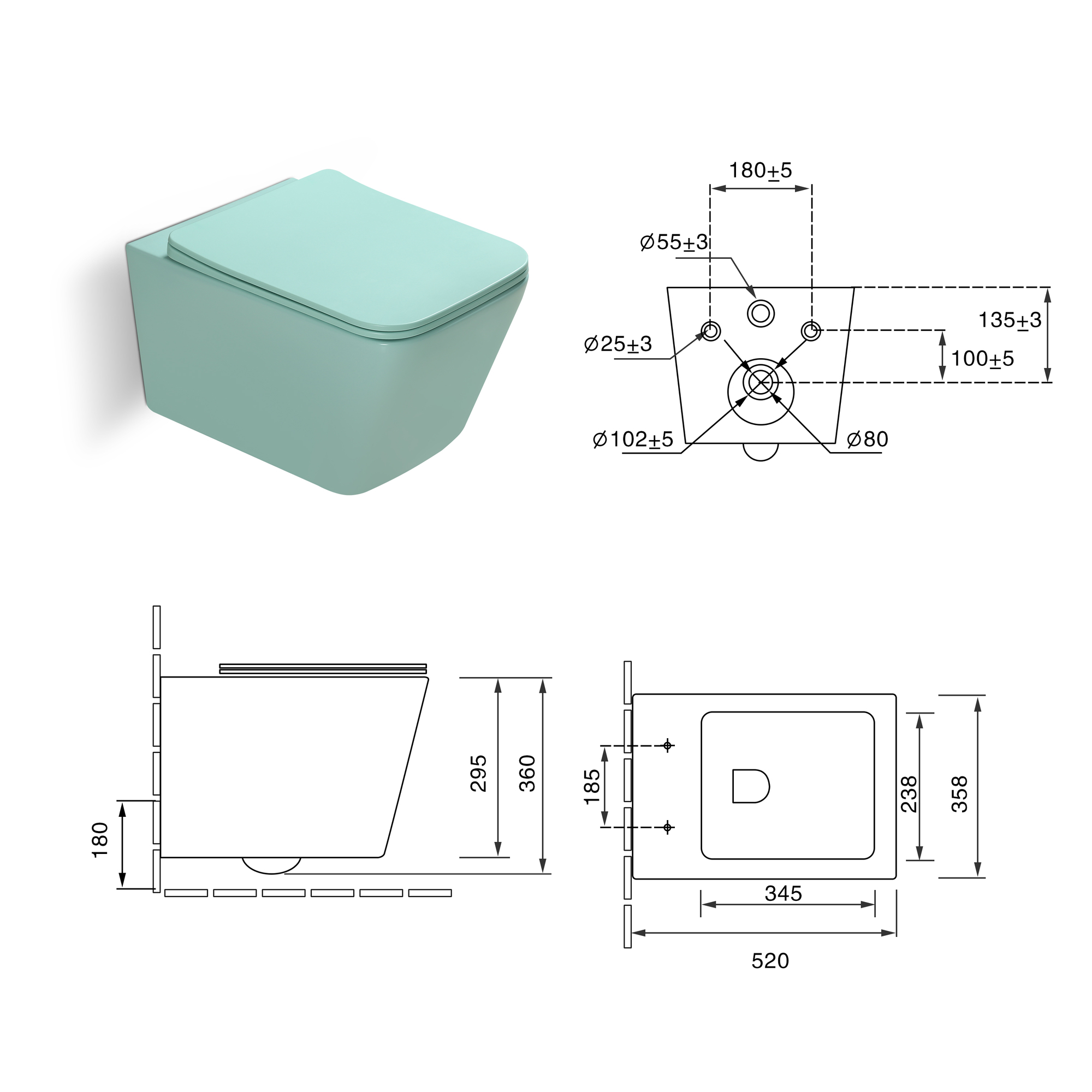 Главная Продукция УНИТАЗЫ Унитазы цветные Унитаз подвесной, безободковый, система смыва Tornado (светло-зелёный матовый)
