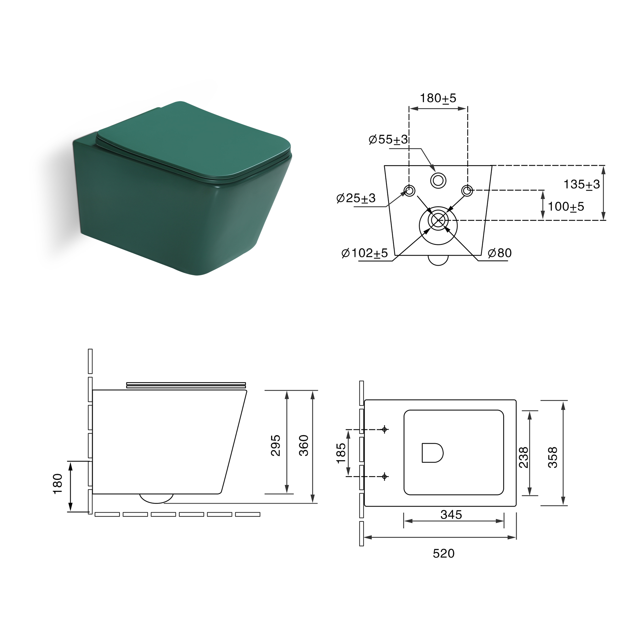 Главная Продукция УНИТАЗЫ Унитазы цветные Унитаз подвесной, безободковый, система смыва Tornado(зелёный матовый)