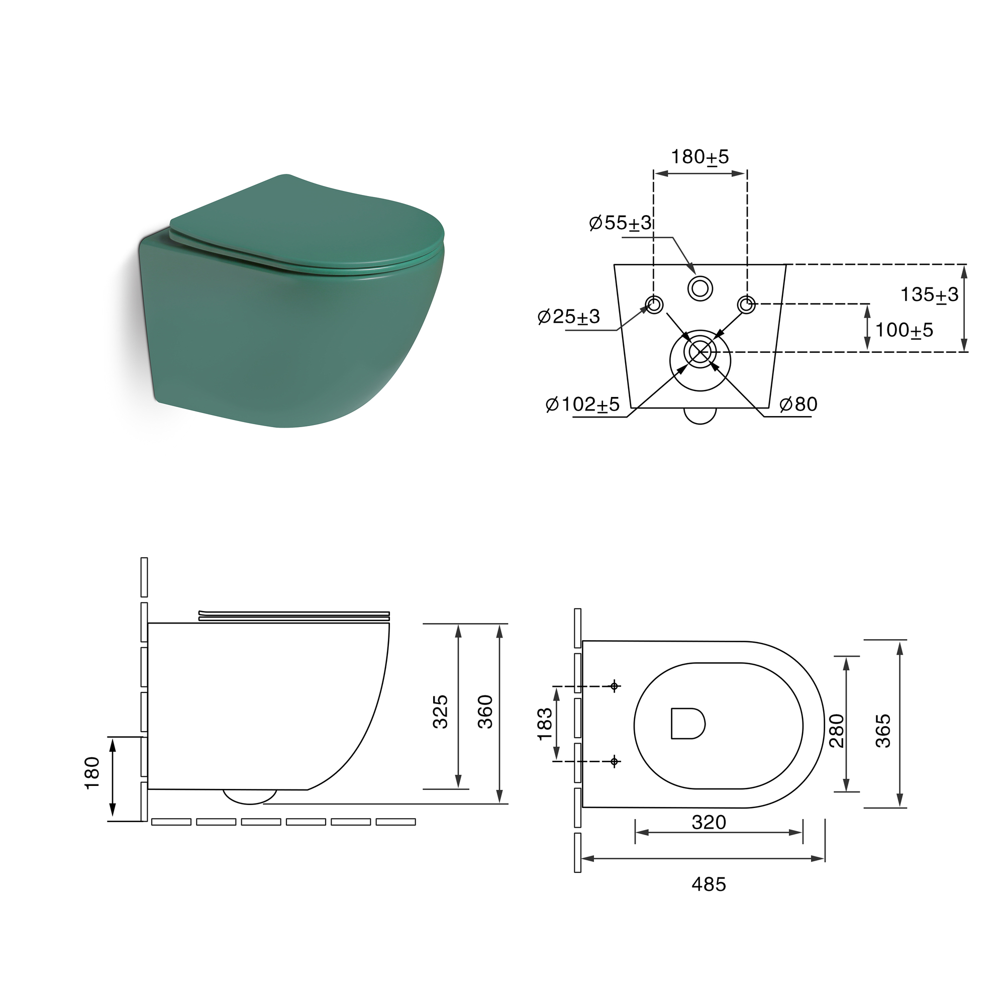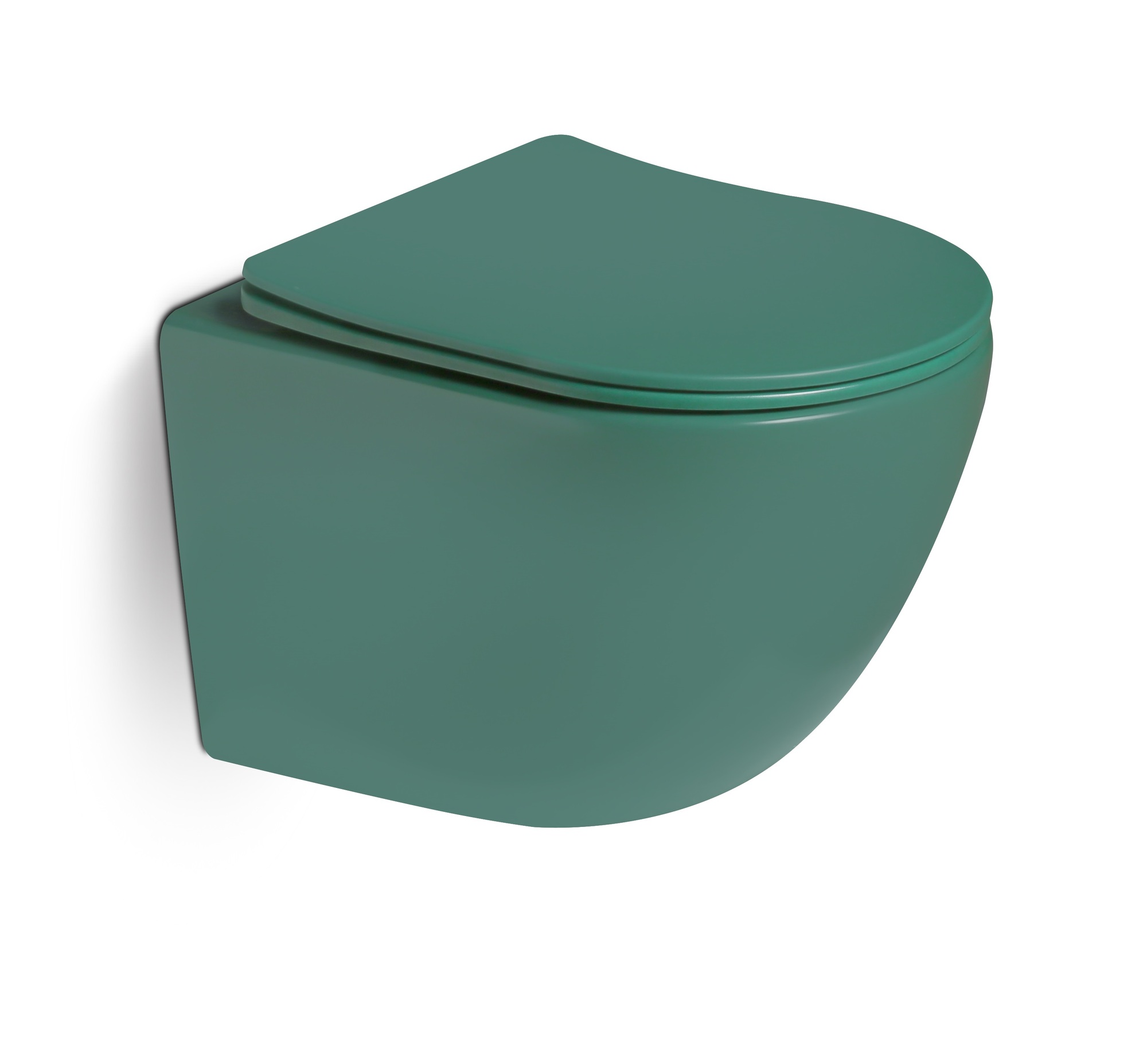 Главная Продукция УНИТАЗЫ Унитазы цветные Унитаз подвесной, безободковый, система смыва Tornado(зелёный матовый)