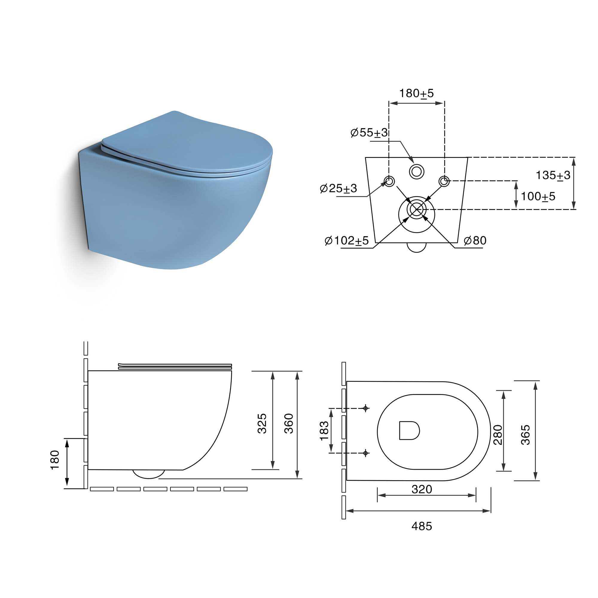 Унитаз подвесной, безободковый,система смыва Tornado (голубой матовый)