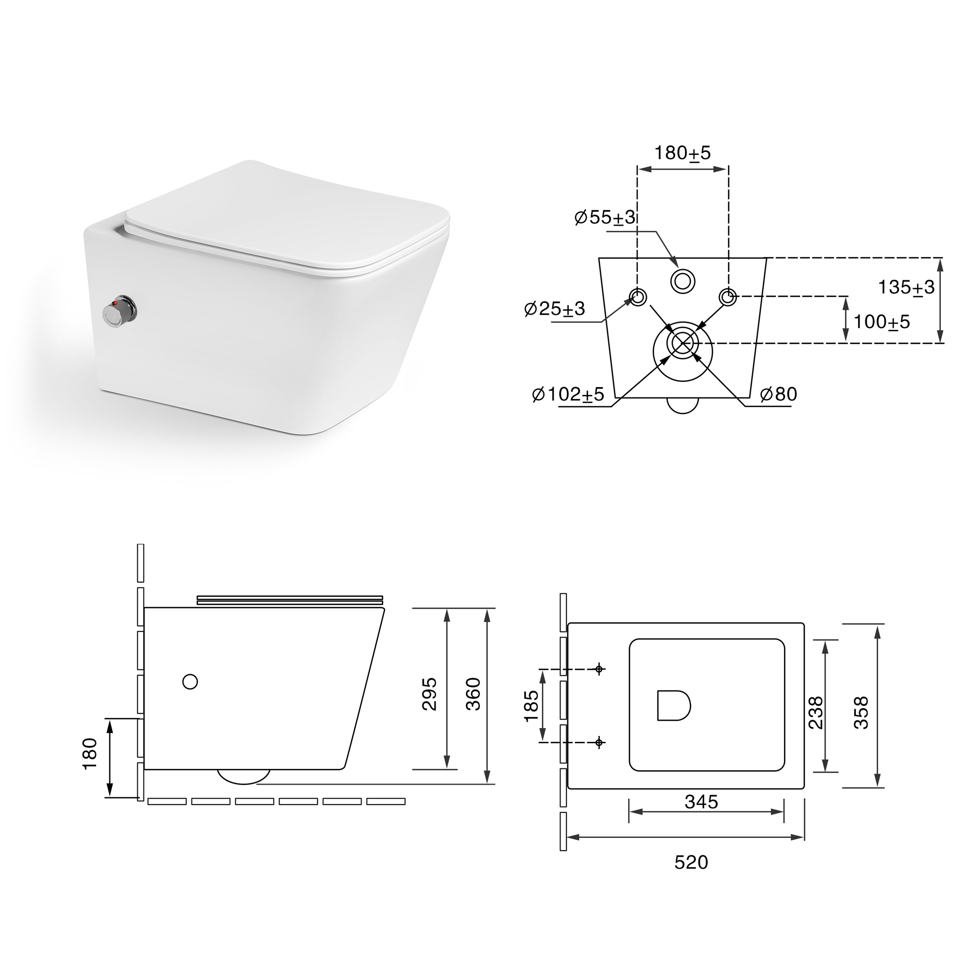 Унитаз подвесной безободковый, система смыва Tornado с встроенным смесителем и функцией биде