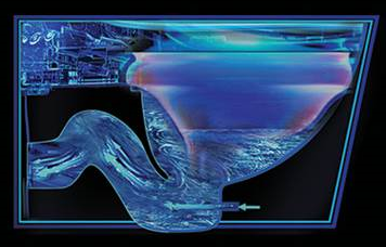 - Первоначально происходит спуск воды по первому (верхнему) каналу по принципу торнадо, далее срабатывает второй (нижний) канал, который под давлением выталкивает содержимое в канализацию, затем повторно срабатывает первый (верхний) канал, который ополаскивает унитаз и заполняет колено гидрозатвора